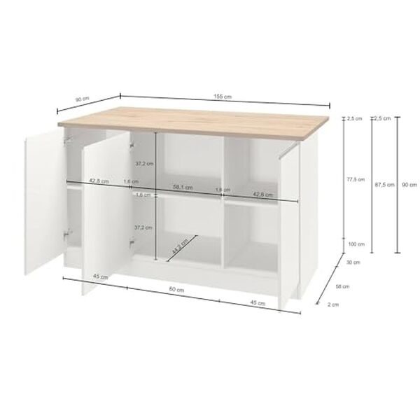 Dmora - Îlot de Cuisine Patrizio, Armoire Polyvalente, Meuble de kitchenette, Table auxiliaire, 100% Made in Italy, 155x90h90 cm, Blanc Brillant et chêneÎLOT DE CUISINE - Table de rangement auxiliaire, meuble de cuisine 3 portes, 100% Made in Italy, 155x90h90 cm, Blanc brillant et chêne STRUCTURE ET UTILISATION - Meuble îlot pratique et peu encombrant structuré de trois portes battantes et de six compartiments internes - Les portes sont équipées de poignées encastrées en aluminium et de charnières solides - Les compartiments ouverts sont idéaux pour ranger vos ustensiles de cuisine ou vos magazines lorsqu'ils ne sont pas utilisés - Les étagères intérieures sont parfaites pour ranger un petit garde-manger - Ce meuble est parfait pour décorer la salle à manger, la kitchenette, le salon ou la cuisine contenant de la vaisselle , verres, nappes, couverts, livres, documents ou objets de décoration de manière ordonnée FABRIQUÉ EN ITALIE - L'article est produit en Italie, avec l'utilisation des meilleurs matériaux et la plus haute qualité et attention aux détails - Le soin des processus de production est synonyme de fiabilité, de résistance et de raffinement - La certification Made in Italy est une garantie complète conformité aux réglementations de l'Union européenne CARACTÉRISTIQUES TECHNIQUES - Meuble entièrement construit en panneaux de mélamine, il résiste aux chocs et aux rayures et est durable dans le temps - Nettoyage facile et rapide grâce au matériau dont il est composé - Livré démonté avec kit de montage et livret d'instructions - Soin et attention particuliers à l'emballage, résistant et adapté au transport - Certification ISO 9001 pour la conception et la fabrication de meubles en kits - Articles conformes aux normes FSC/STD/40/004 v31 DIMENSIONS EN CM, Meuble îlot : Longueur : 155 Largeur : 90 Hauteur : 90589,99 €